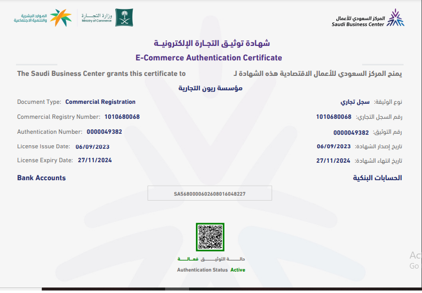 شهادة توثيق التجارة الالكترونية رقم : 0000049382